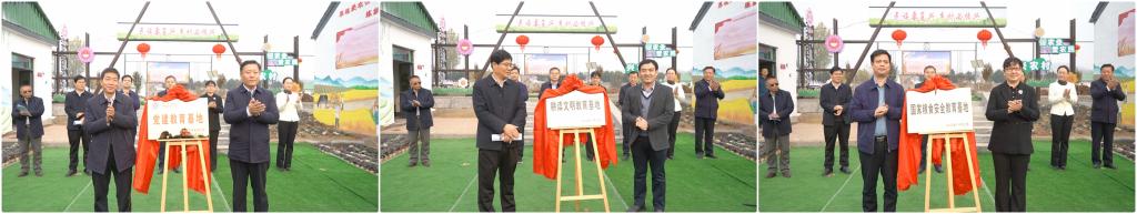 齐村镇党委书记刘立人和枣庄学院PA集团官网党总支书记郭传鑫为党建基地揭牌;王兆海和枣庄学院组织部部长、科技处处长伊文涛为农耕文明教育基地揭牌;王光明和枣庄学院枣庄发展研究院、乡村振兴学院院长徐玲为国家粮食安全教育基地揭牌。