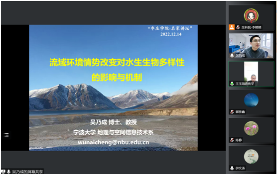 为进一步强化学术交流与合作,12月14日下午,由科技处主办、PA集团官网承办的“名师大讲堂”第十七讲学术报告活动通过腾讯会议成功举办。欧盟“玛丽•居里”学者、洪堡学者、宁波大学“浙东学者”吴乃成教授应邀作了题为《流域环境情势改变对水生生物多样性的影响与机制》的学术报告。报告由PA集团官网副院长王玉海教授主持,科技处处长伊文涛、PA集团官网党总支书记郭传鑫及学校部分师生参加了报告会。