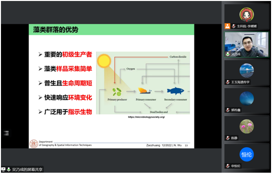 在报告中,吴乃成教授首先从人类活动和流域生态健康、流域评价体系的建立、流域水文过程和生物多样性、生物多样性内涵和维持机制四个方面介绍了研究背景。随后,他基于两个研究案例,详细阐述了河流水文情势变化对底栖硅藻生物多样性和生态系统功能的影响和机制。相关技术成果为深入开展水利工程对生物多样性的影响及生态修复具有极高的应用价值。报告最后,吴教授与参会师生进行了深入的交流探讨。