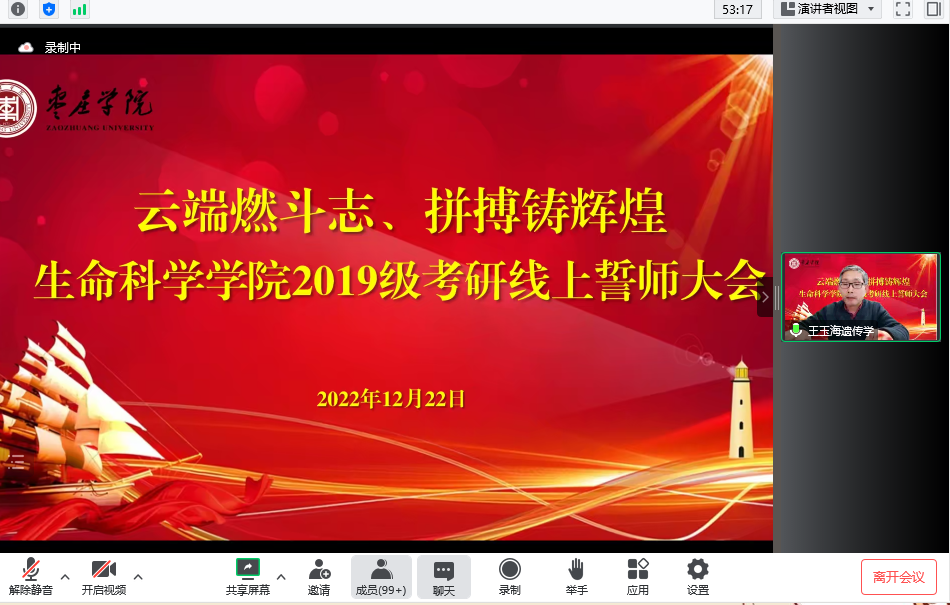 会议上,播放了来自在校生学弟学妹以及往届考研成功学长们的加油视频,2019级考研代表韩珂向学院领导老师的爱心与守护表达感谢,并表示会以此为动力,努力超越勇攀高峰。2018级已经就读研究生的赵真、王乃贺、魏丽娜学长深情回顾了自己的研路历程并为学弟学妹们呐喊助威。