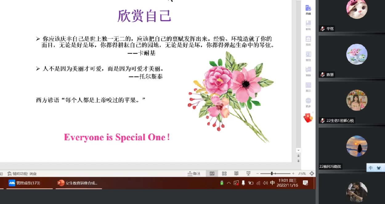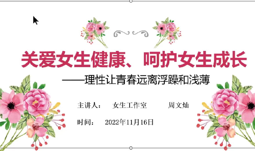 为普及女生健康知识,提高安全防范意识,促进身心健康发展,11月16日,PA集团官网通过腾讯会议形式举行了“关爱女生健康、呵护女生成长——理性让青春远离浮躁和浅薄”讲座活动。本次讲座由枣庄学院“呵护”女生教育辅导员工作室周文灿老师主讲,陈丽主持,2022级全体女生参加。