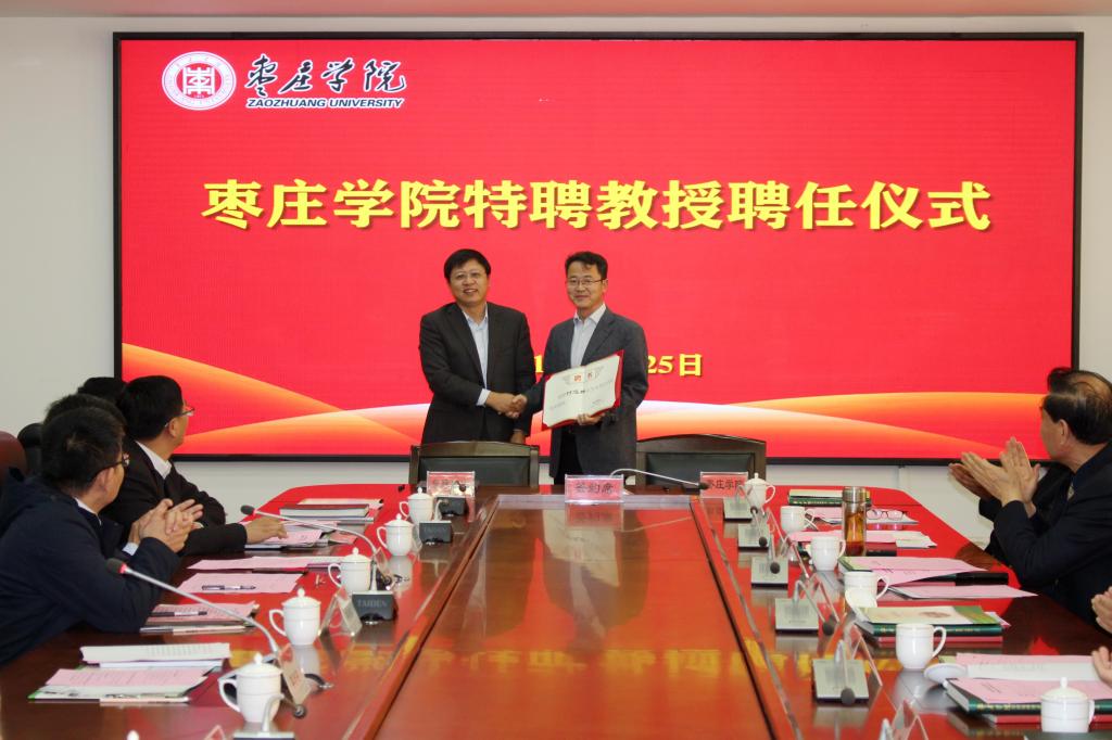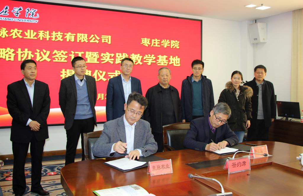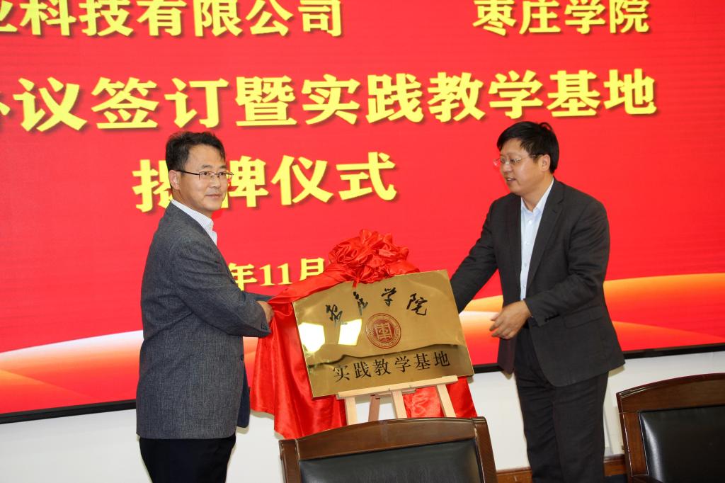枣庄学院分别与泉脉农业科技有限公司和大宗集团有限公司签订合作协议,李目海为实践教学基地揭牌。