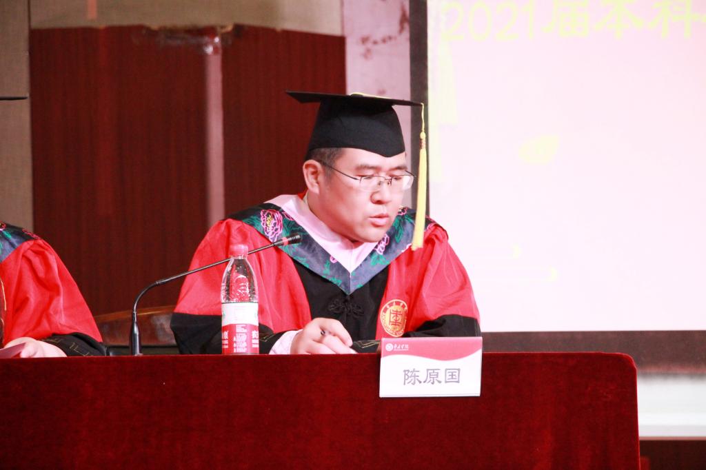 最后,副处级组织员陈原国发表了讲话,陈原国首先向圆满完成学业的2021届本科生表示祝贺,并提出三点希望:一是顺境不惰,逆境不馁;二是始终不忘初心,坚守信念;三是大家都能保持一颗平凡和敬畏的心。希望同学们走出校园,能继续秉承“兼爱、尚贤、博物、戴行”的枣院校训和“物承生命,生生不息,向上向善,求真务实”的生科精神,阔步迈向更加精彩的人生历程,鹏程万里,前程似锦!