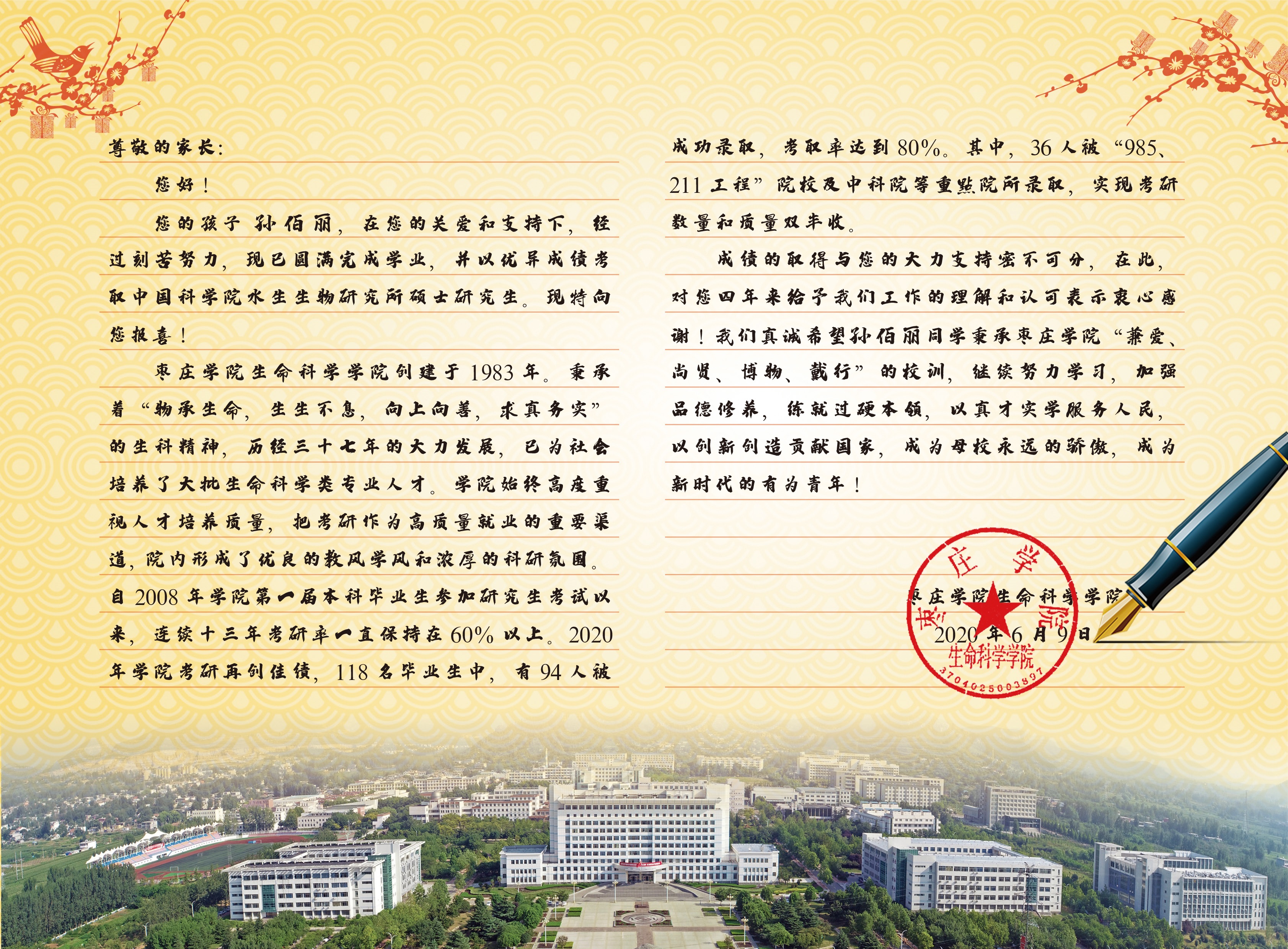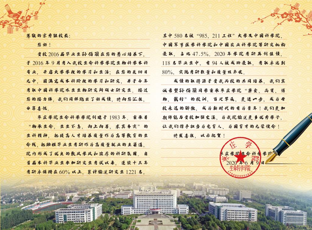 从2008年起,每年给学生家长邮寄“考研喜报”已经成为生科院的传统,今年,在“考研喜报”的基础上,又增加了“生源学校校长喜报”。一封薄薄的喜报,传递的是一份浓浓的祝愿,旨在向学生家长和生源学校表示祝贺,共同分享学生成长过程中的收获与喜悦,对他们在PA官网人才培养过程中给予的支持表达感谢,同时鼓励更多的生科学子在今后的学习和生活中积极进取,为母校争光。同时,寄发喜报有利于扩大学校和学院在省内外生源学校的知名度,增强学校办学软实力和品牌效应。