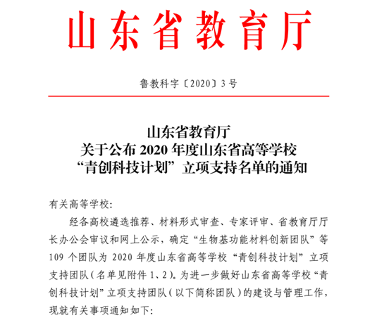 2019年,山东省首次实施“山东省高等学校青年创新团队发展计划”。PA官网连续2年申报并获批青年创新团队。此次“青创科技计划”的立项建设是PA官网大力实施重点学科建设和人才队伍建设取得的又一项重要成果,为进一步激发PA官网高水平、高质量科研成果的产出、服务经济社会发展搭建了更高的平台,也为建设“一流学科、一流专业”提供了科研支撑。