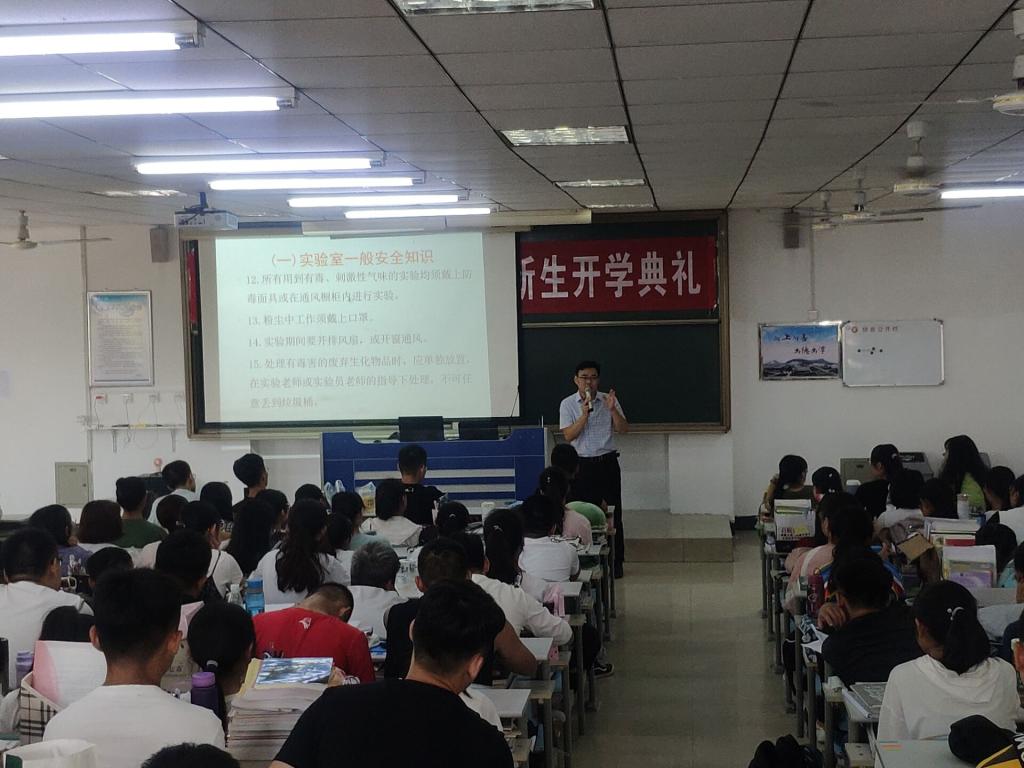 开学典礼结束后,由生物技术专业、生物科学专业和植物科学与技术专业教研室主任康美玲、贺诗水和明东风老师,分专业对同学们进行了专业导航报告;生物科学实验中心陈青进行了实验室安全讲座,并带领新同学参观了实验中心。