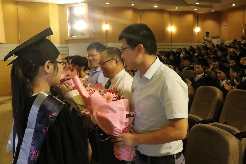 毕业生学生代表李世龙发言后,毕业生代表为老师们送上感恩的花束。“不管走到哪里,不管在什么岗位,让我们继续填写好人生的履历表,交出事业的优秀答卷,为母校的旗帜增辉添彩!”现场真情动容,掌声不断。