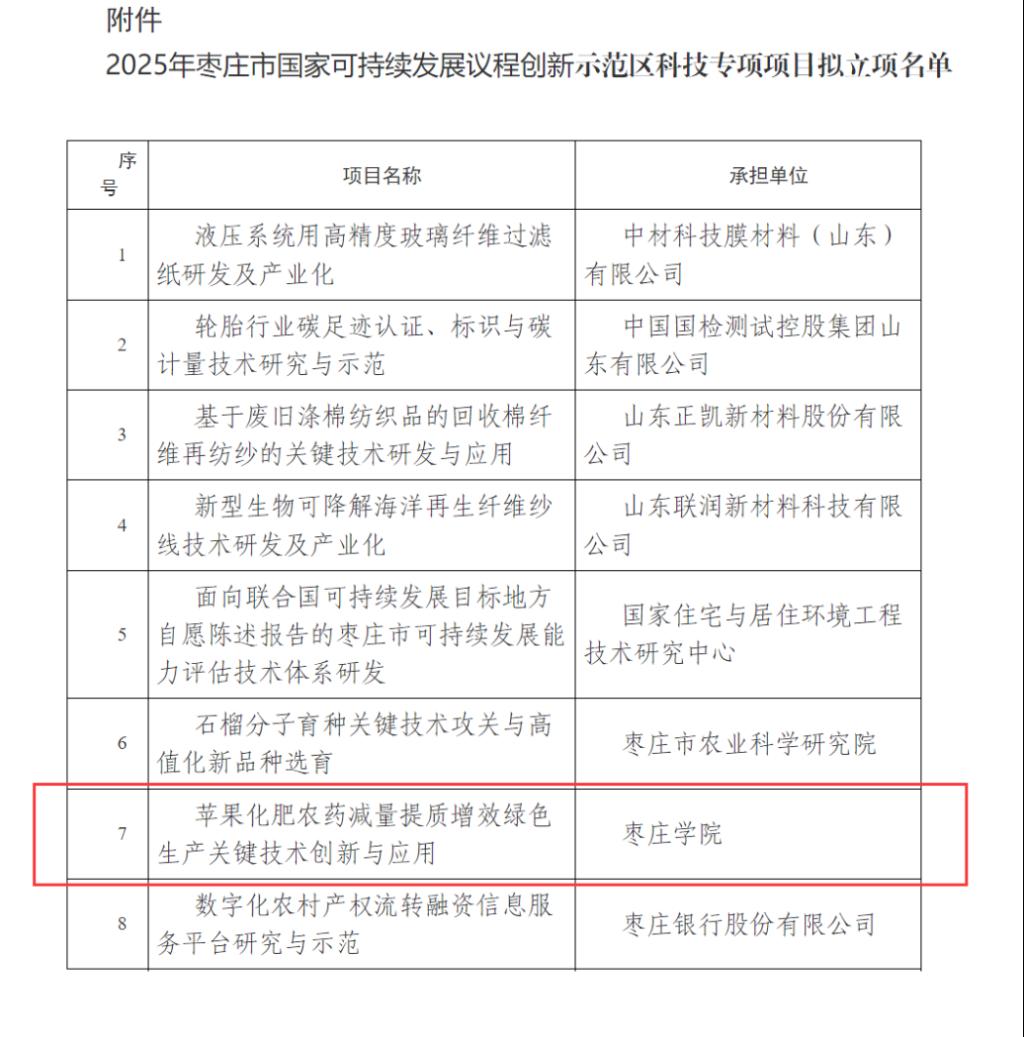 近日,枣庄市科技局公布了2025年枣庄市重点研发计划——国家可持续发展议程创新示范区科技专项立项结果,PA官网牵头联合山东锦硕生态农业科技有限公司申报的“苹果化肥农药减量提质增效绿色生产关键技术创新与应用”项目成功获批,项目经费35万元。PA官网特色果树植物保护团队曹辉博士为项目负责人。这是学院首次以牵头单位身份承担枣庄市国家可持续发展议程创新示范区科技专项,标志着学院在服务地方经济、推动产学研深度融合方面迈出关键一步。