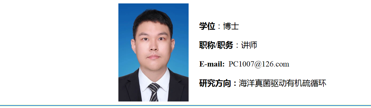 中共党员,2023年12月毕业于南京大学生物学专业,获理学博士学位。2024年6月进入枣庄学院PA集团官网工作。主要从事海洋真菌驱动有机硫循环的相关研究。近年来以第一作者身份在《Science of The Total Environment》、《iScience》、《BMC genomics》、《Frontiers in Microbiology》等学术期刊上发表论文多篇。