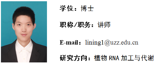 李宁,男,2021年6月毕业于复旦大学生物化学与分子生物学专业获得理学博士学位。2024年11月进入枣庄学院PA集团官网工作。主要从事植物RNA加工与代谢的相关研究。参与国家自然科学基金面上项目2项。近五年来以第一作者或共同作者在《Horticulture Research》、《Frontiers in Plant Science》、《复旦学报》等刊物上发表SCI论文3篇。