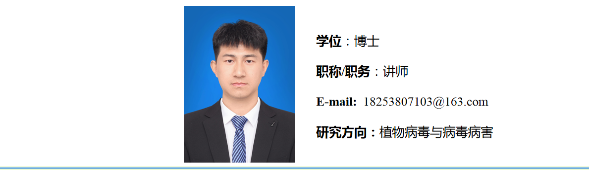 2023年6月毕业于山东农业大学植物病理学专业,获农学博士学位。2023年9月进入枣庄学院PA集团官网工作。主要从事植物病毒与病毒病害的相关研究。近年来以第一或共同作者身份在《Molecular Plant Pathology》、《Plant Disease》、《PLOS ONE》等学术期刊上发表论文多篇。