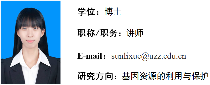 孙丽雪,女,2023年1月毕业于复旦大学植物学专业获得理学博士学位。2024年11月进入枣庄学院PA集团官网工作。主要从事基因资源的利用与保护的相关研究。近五年来以第一作者或者共同作者在《Biology》、《Physiologia Plantarum》等刊物上发表SCI论文2篇。