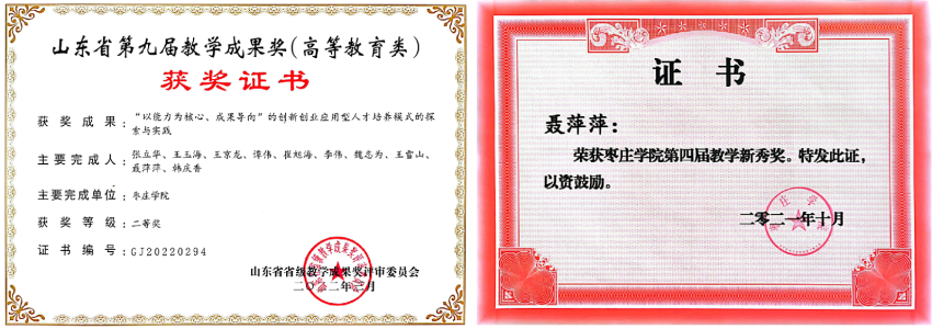 作为一名创新创业教研室主任,为深化创新创业教育改革,提升大学生的创新精神、创业意识和创新创业能力,依托学校、学院和学科优势,科研与育人相结合的方式,鼓励和指导学生开展创新创业活动。(1)积极并认真组织举办了:2021年山东省大学生生物实验技能大赛、2022年山东省大学生生物实验技能大赛、第九届山东省大学生生物化学实验技能大赛、第十届山东省大学生生物化学实验技能与创新创业大赛、第十一届山东省大学生生物化学技能与创新创业大赛、第八届山东省大学生医药生物技术实验技能大赛、第九届山东省大学生医药生物技术实验技能大赛,枣庄学院2021年、2022年、2023年和2024年大学生生物化学实验技能大赛,枣庄学院2021年、2022年、2023年和2024年大学生生物实验技能大赛,枣庄学院2021年、2022年、2023年和2024年大学生医药生物技术实验技能大赛;完成了各年级学生的创新创业学分申请认定工作;(2)自2019年以来,指导学生竞赛荣获:全国大学生生命科学竞赛国家级三等奖7项,全国大学生生命科学创新创业大赛山东省赛区二等奖9项、三等奖3项,第八届山东省大学生医药生物技术技能大赛(一等奖)、第九届山东省大学生生物化学实验技能大赛(一等奖)、第九届山东省大学生医药生物技术技能大赛(一等奖)、2021年和2022年山东省大学生生物学大赛(均荣获一等奖)、第十届山东省大学生生物化学技能与创新创业大赛(一等奖)、山东省大学生医养健康创新创业大赛(一等奖)等省级各类创新创业大赛奖励80余项;国家级、省级大学生创新创业训练计划项目8项、校级SRT项目16项。
