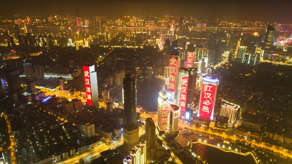 1月31日,武汉市江汉区西北湖附近高层建筑外墙打出“武汉加油”等字样(无人机照片)。新华社记者 肖艺九 摄