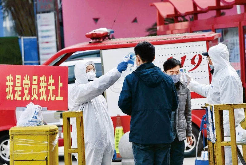 2月3日,湖北省武汉市武昌区南湖中央花园社区工作人员为进出小区的居民测体温。湖北日报全媒体记者 李溪 摄